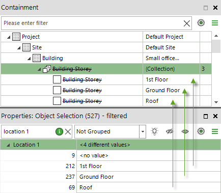 Faites glisser et déposez tous les objets appartenant à un bâtiment au-dessus de ce bâtiment dans la palette Confinement. Cela changera le confinement de sorte que tous les objets soient contenus directement par ce bâtiment.